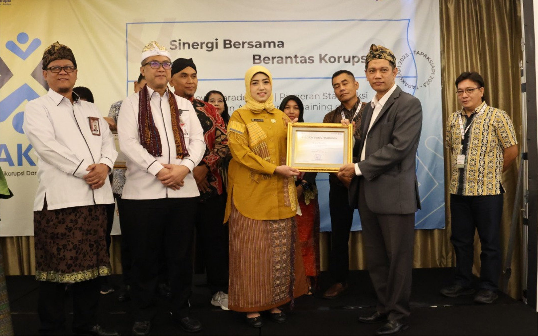 JAKARTA - Ketua Forum Penyuluh Anti Korupsi Provinsi Banten Rt. Syafitri Muhayati terima penghargaan dari Komisi Pemberantasan Korupsi (KPK) Republik Indonesia. Penghargaan itu diserahkan oleh Pimpinan KPK Nurul Ghufron pada acara Temu Aksi Penyuluh Antikorupsi dan Ahli Pembangun Integritas (TAPAKSIAPI) 2023 dalam peringatan Hari Antikorupsi se-Dunia (HAKORDIA) 2023 dilaksanakan di Ballroom Century Park Hotel Jl. Pintu Satu Senayan, Jakarta Pusat, Senin (11/12/2023)